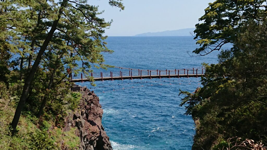 門脇つり橋は長さ48m、高さ23mの迫力ある架橋で、断崖と海を間近に感じながら渡ることができます。足元を通る波しぶきや潮風が体を包み、まるで大自然の一部になったかのような感覚を味わえるのが魅力です。観光シーズンには多くの人で賑わいますが、スリルを楽しみながら渡れば特別な思い出になるでしょう。
