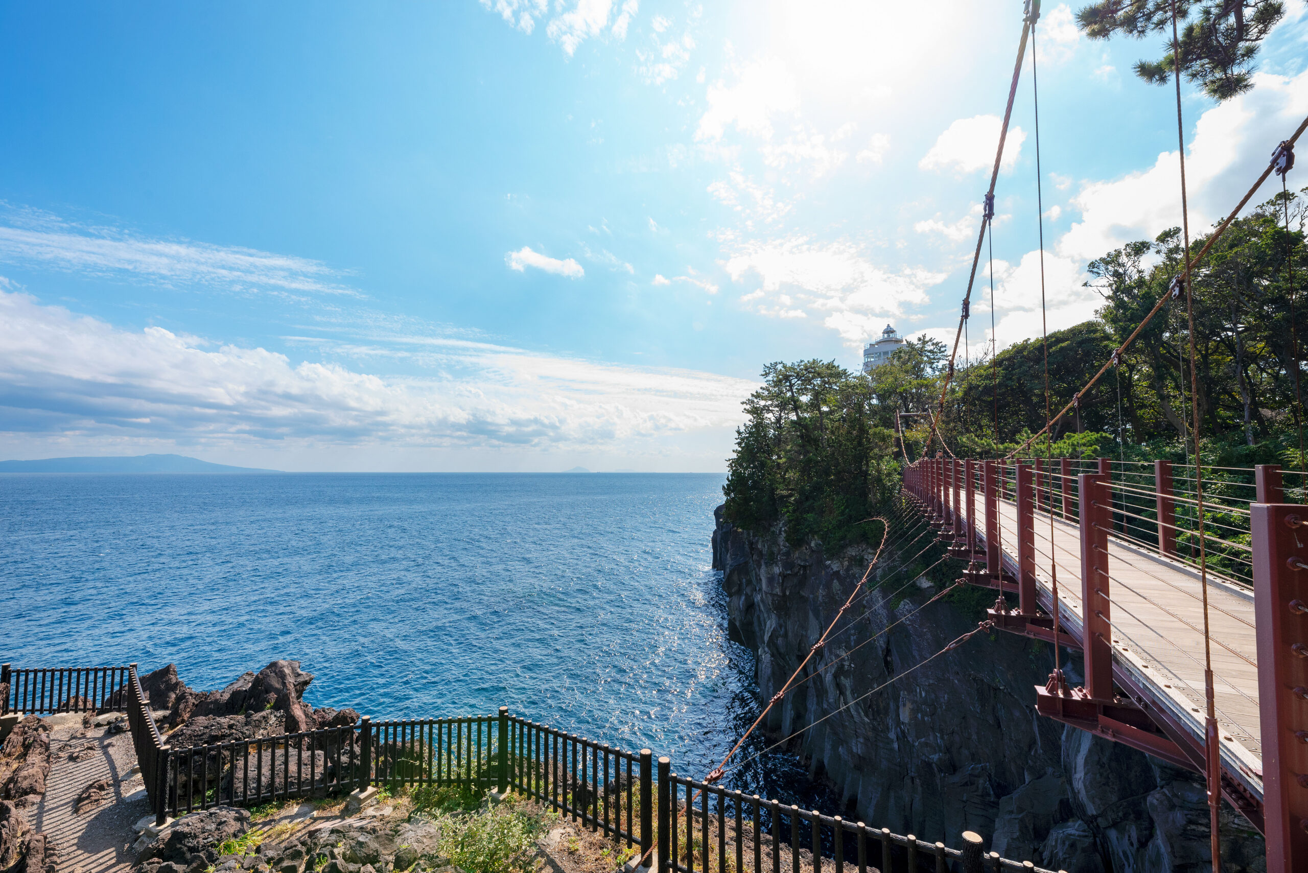 城ケ崎海岸は、溶岩で形成された雄大な断崖絶壁と豊かな自然が魅力の伊豆を代表する景勝地です。海沿いの遊歩道やつり橋など、スリルある絶景スポットが多く、季節の花々や美しい自然も楽しめます。