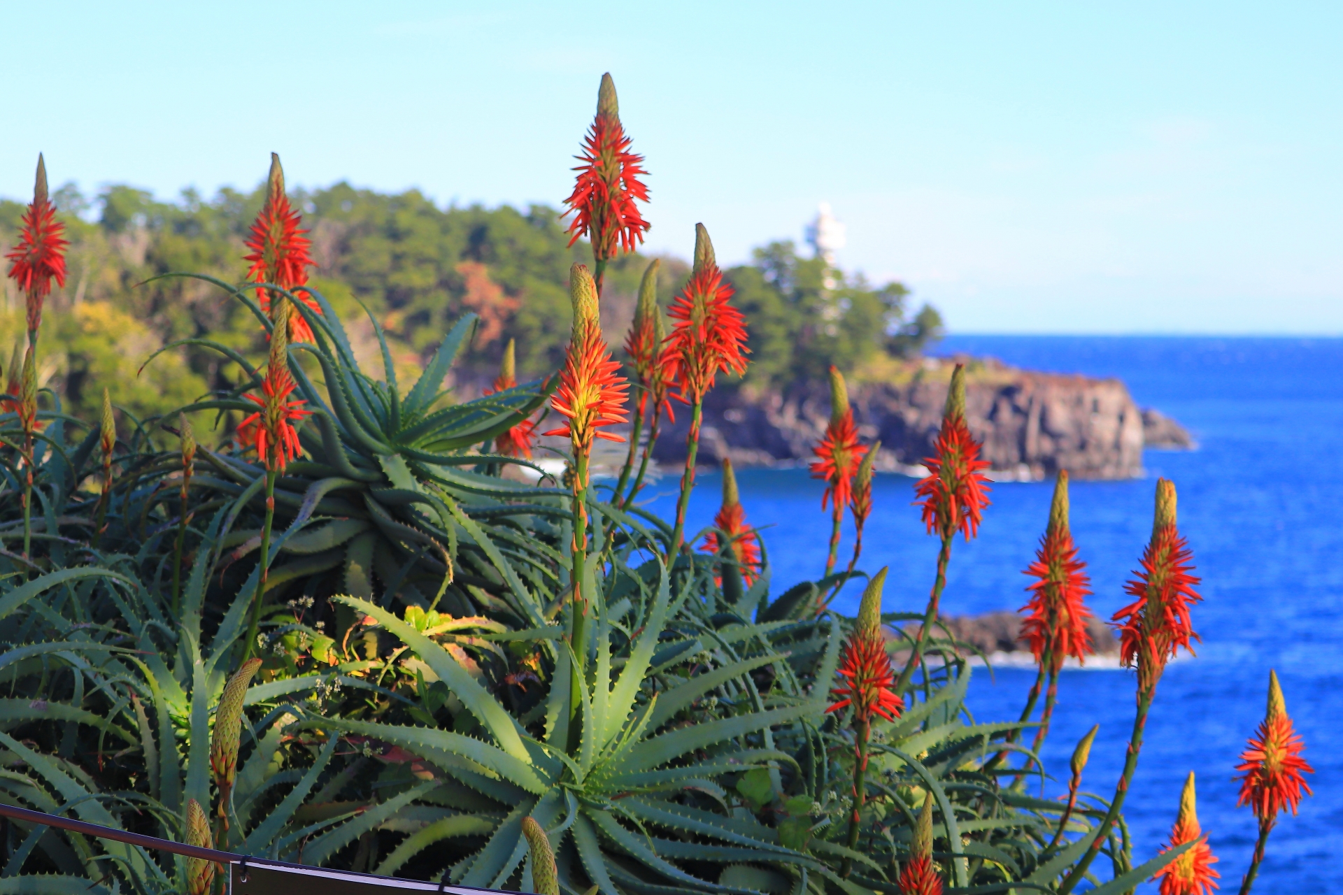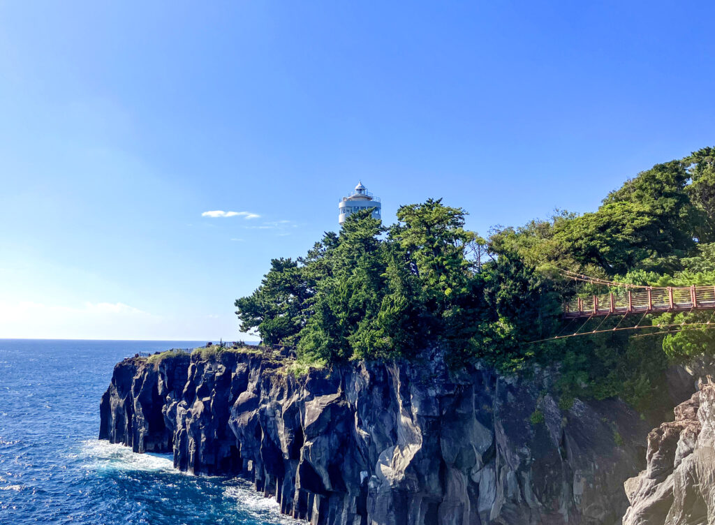 門脇埼灯台は、白亜の塔が印象的な海辺のシンボルです。展望デッキからは、伊豆の海や天城連山、さらに天候が良ければ遠く伊豆七島まで見渡せる360度のパノラマビューが広がります。眼下に広がる断崖絶壁や青い海とのコントラストはまさに壮観で、一度は体験しておきたい城ヶ崎ならではの絶景スポットです。